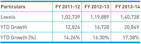 SBIFMPL posted a net profit of `155.57 crores during FY 2013-14 compared to `85.68 crores in FY 2012-13. The Company mobilised over `8000 crores in debt funds. SBIFMPL opened 51 new branches beyond top 15 cities across 23 states and one Union Territory, first by any Mutual Fund House in India, which takes Mutual Fund asset class to pan-India investors.