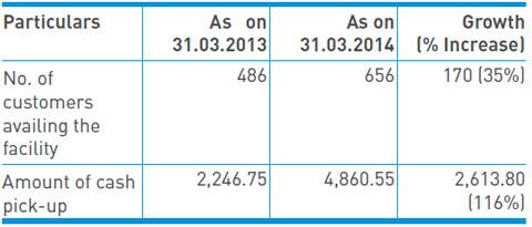 Over 11,423 BC outlets have been set up across urban/ metro centres, which cater to the requirements of migrant labourers and vendors, among others. During FY 2013-14, 226 lakhs remittance transactions for `9,983 crores were registered through BC channel.