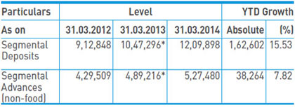 The Bank's aggregate liabilities (excluding capital and reserves) rose by 14.08% from `14,67,327.59 crores on 31st March, 2013 to `16,73,952.35 crores on 31st March, 2014. The increase in liabilities was mainly contributed by increase in deposits and borrowings. The Global deposits rose by 15.94% and stood at `13,94,408.50 crores as on 31st March, 2014 against `12,02,739.57 crores as on 31st March 2013. The borrowings increased by 8.24% from `1,69,182.71 crores at the end of March 2013 to `1,83,130.88 crores as at the end of March 2014.