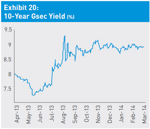 The forecast for below normal rainfall in current fiscal does not augur well for agricultural production. There were also unseasonal rains, accompanied by hailstorm and frost during early part of March 2014 in various parts of the country, adversely impacting Rabi crops. However, the good thing is that, led by higher crop production, agricultural GDP including allied sector is poised to grow by 4.7% in FY 2013-14, over three times higher than 1.4% in the previous year. Industrial growth continues to remain sluggish due to lackluster investment climate, stalled projects and subdued consumption demand. Persistent contraction in the mining sector, owing to regulatory and environmental hurdles also contributed to the overall decline in industrial activity.