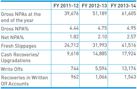 `14,223.57 crores (net of write-back) for non-performing assets (as against `11,367.79 crores in 2012-13).