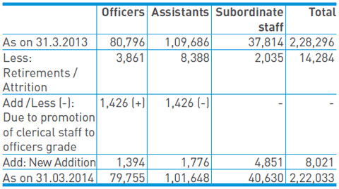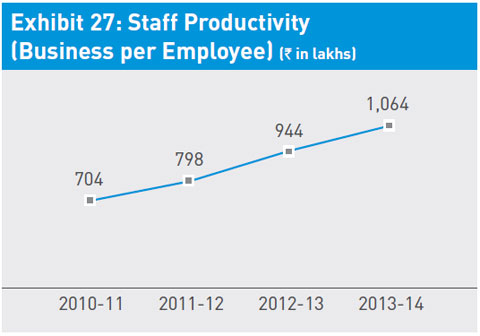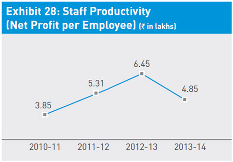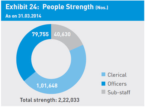 There was an increase of 22.43% in the Staff Cost from `18,380.90 crores in 2012-13 to `22,504.28 crores in 2013- 14. The main reasons for increase were higher provision for pension liability due to revision in mortality table from 01.04.2013, impact of which was `2,400.00 crores and provision for wage revision to the tune of `1,814.00 crores. Other Operating Expenses registered an increase of 21.26% mainly due to increase in expenses on rent, taxes and lighting, law charges, postage, telephones, printing and stationery, insurance and miscellaneous expenditure.