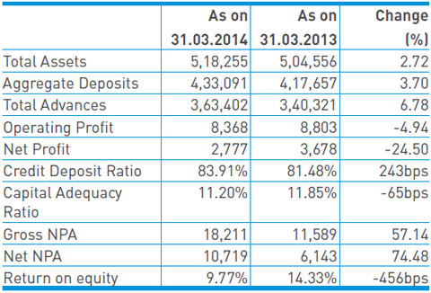 Given the system wide economic slowdown, the financial performance of the Bank during the financial year ended 31st March, 2014, remained satisfactory. The Bank registered a good growth in Operating Profit during the fourth quarter of the year as compared to previous quarters. The Operating Profit of the Bank for 2013-14 was higher at `32,109.24 crores, as compared to `31,081.72 crores in 2012-13, an increase of 3.31%.