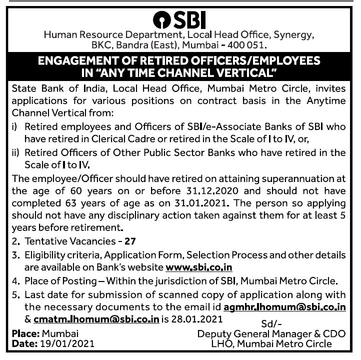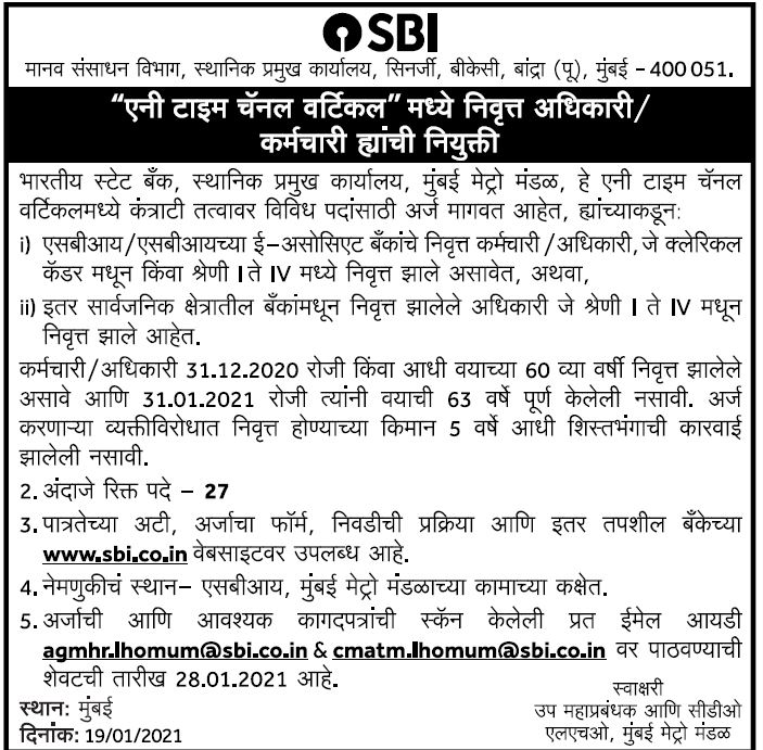 ENGAGEMENT OF RETIRED OFFICERS OF STATE BANK OF INDIA / e-ABs OF SBI AND RETIRED OFFICERS OF OTHER PUBLIC SECTOR BANKS FOR THE POST OF “BUSINESS CORRESPONDENT FACILITATORS (BCF) ON CONTRACT BASIS” FOR WORKS AT MUMBAI METRO CIRCLE LOCATIONS: (Advt. Dated 20.11.2020)